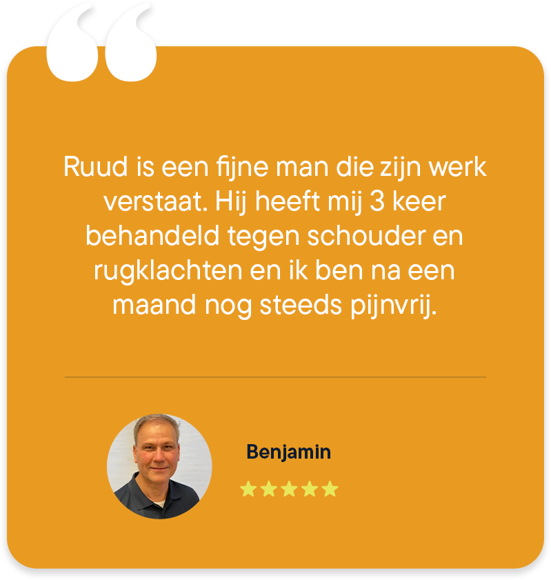 "Ruud is erg prettig en kundig. Ik heb de behandelingen als fijn ervaren en het heeft goed geholpen. Hij neemt de tijd om te luisteren wat er speelt en onderzoekt waar de klachten vandaan komen. Vervolgens legt hij duidelijk uit wat hij gaat doen en gaat secuur te werk. Echt een aanrader! Dank je wel Ruud."